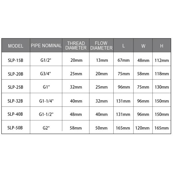 | SLP-25B | G1” | 32mm | 25mm | 96mm | 75mm | 130mm |